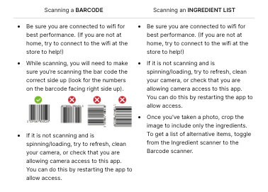- The ingredient list scanner is an alternative option for products that may not yet be in our database. Instead of pulling product data, it reads the ingredient list you scan and determines the product’s label based solely on those ingredients.
